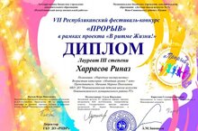 Учащийся класса баяна Харрасов Риназ принял участие в VII Республиканском фестивале-конкурсе "Прорыв" в рамках проекта "В ритме Жизни". В номинации "Народные инструменты" младшая группа (7лет) Риназ стал Лауреатом III степени. Педагог Минаева Марина Николаевна получила Благодарственное письмо от оргкомитета Фестиваля. Поздравляем Риназа и его педагога Минаеву М.Н. с отличным результатам и желаем новых творческих побед!