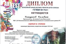 Учащиеся класса фортепиано приняли участие во Всероссийском конкурсе - фестивале "Тетюши ART-FEST" и стали победителями в своей возрастной категории. Каиргельдинов Илья Лауреат II степени в возрастной категории 7-9 лет, преподаватель Кузнецова Елена Николаевна. Салихова Амина Лауреат II степени в возрастной категории 10-12 лет, преподаватель Маланчева Венера Рафкатовна. Ситдиков Салават Лауреат III степени в возрастной категории 13-15 лет, преподаватель Кузнецова Елена Николаевна. Поздравляем ребят и их педагогов с высокими достижениями и желаем им творческих успехов!