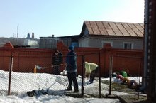 Раскидываем снег что-бы поскорее наша площадка стала пригодна для прогулок .