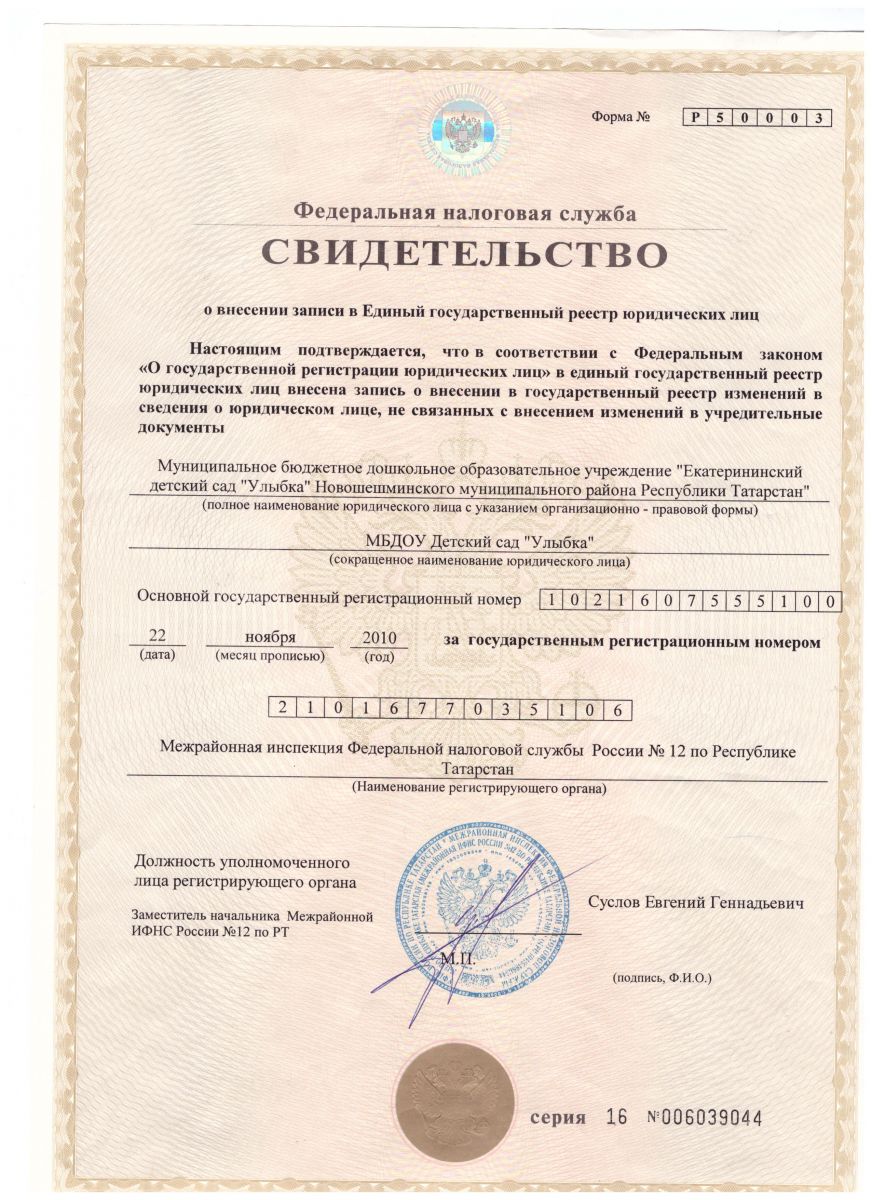 СВИДЕТЕЛЬСТВО о внесении записи в Единый государственный реестр юридических лиц