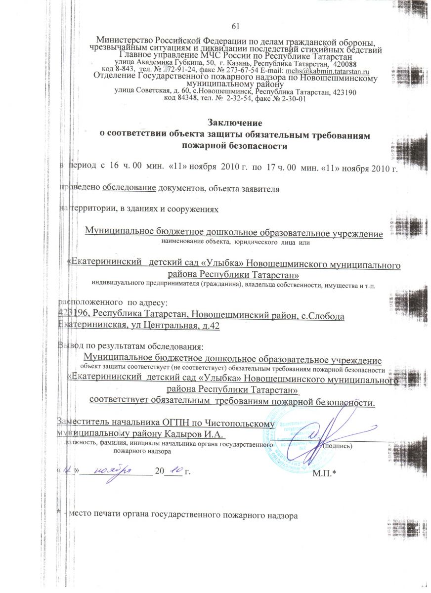 Заключение о соответствии объекта защиты обязательным требованиям пожарной безопасности.