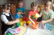 Ребята из старшей группы совместно с воспитателем Гаревой О.А. моют игрушки.