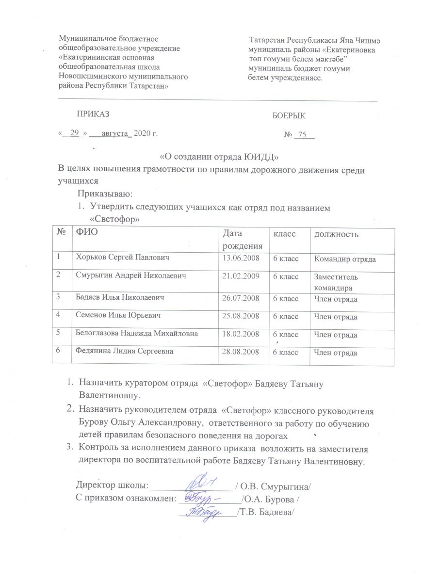 Отряд ЮИДД "Светофор" Приказ о создании отряда + План работы + План месячника безопасности "Внимание, дети!"