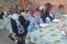 Ученики 1 б класса после приятной и полезной прогулки с удовольствием и с аппетитом едят вкусную кашу.