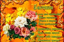 Уважаемые коллеги! С профессиональным праздником вас - с Днем Учителя! Учитель — гордое звание, которое по жизни несут только самые заслуженные и достойные! Так пусть же учительские нелегкие будни приносят только радость и будут плодотворными. Пусть ученики будут усердными, старательными — такими, которыми можно гордиться. А в семье пусть воцарятся счастье и уют. Здоровья, любви, достатка и всех жизненных благ!