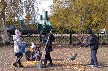 Сегодня ученики с учителями дружно вышли на субботник. Убирали территорию от листьев и мусора.