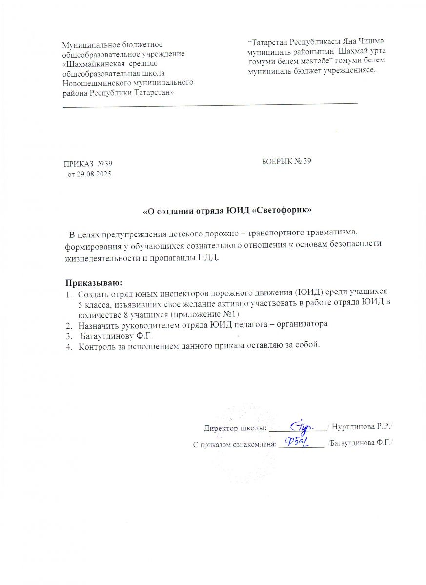 Приказ о создании отряда ЮИД "Светофорик"
