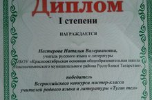 В рамках реализации Государственной программы «Сохранение, изучение и развитие государственных языков Республики Татарстан и других языков в Республике Татарстан на 2014 – 2020 годы» с 25 по 27 марта в Казани прошел Всероссийский конкурс мастер-классов учителей родных языков «Туган тел». Цель данного мероприятия - повышение статуса учителей родных языков и литературы, распространение педагогического опыта и профессионального мастерства, а также создание дополнительных условий для сохранения и поддержки развития татарского языка и литературы, татарской культуры. В заочном туре из нашего Новошешминского района приняли участие учитель татарского языка и литературы Зиреклинского лицея Зарипова Ф.Р. и учитель русского языка и литературы Краснооктябрьской ООШ Нестерова Н.В. После отбора на очный тур прошли оба учителя. Н.В.Нестерова заняла 1 место среди учителей русского языка и литературы. Поздравляем Наталию Валериановну с победой и желаем успехов!