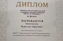 Хаметвалеев Нурислам Айратович - ученик 10 класса МБОУ "Зиреклинский лицей Новошешминского МР РТ", стал призером Республиканской олимпиады среди школьников Путь к Олимпу по физике. Поздравляем Нурислама с победой, молодец , так держать!