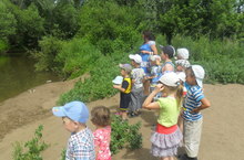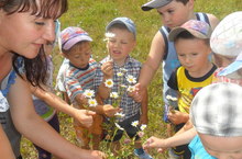 Сбор лекарственных трав с детьми вдоль речки и на футбольном поле (ромашка, подорожник, клевер, пустырник, мать и мачеха).