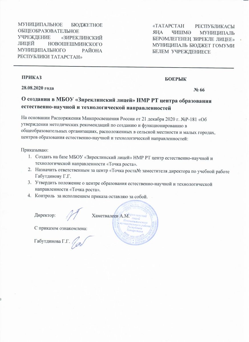 Приказ о создании в МБОУ «Зиреклинский лицей» НМР РТ центра образования естественно-научной и технологической направленностей и назначении ответственного лица