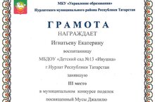 Наша воспитанница принимала учатие в муниципальном конкурсе поделок, посвященном Муса Джалилю с работой "Красная ромашка" и заняла 3 место в номинации "Красная ромашка"