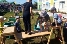 В летне-оздоровительный период - продолжается работа по проекту "Татнефть и детство. Диалог с будущим". Особенно радует детей наличие уличного конструктора, который помогает разнообразить продуктивную прогулку, и конечно же любимые бабашки.
