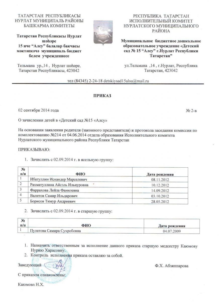 Приказ №2-в от 02.09.2014 г. о зачислении детей в МБДОУ "Детский сад №15 "Алсу"