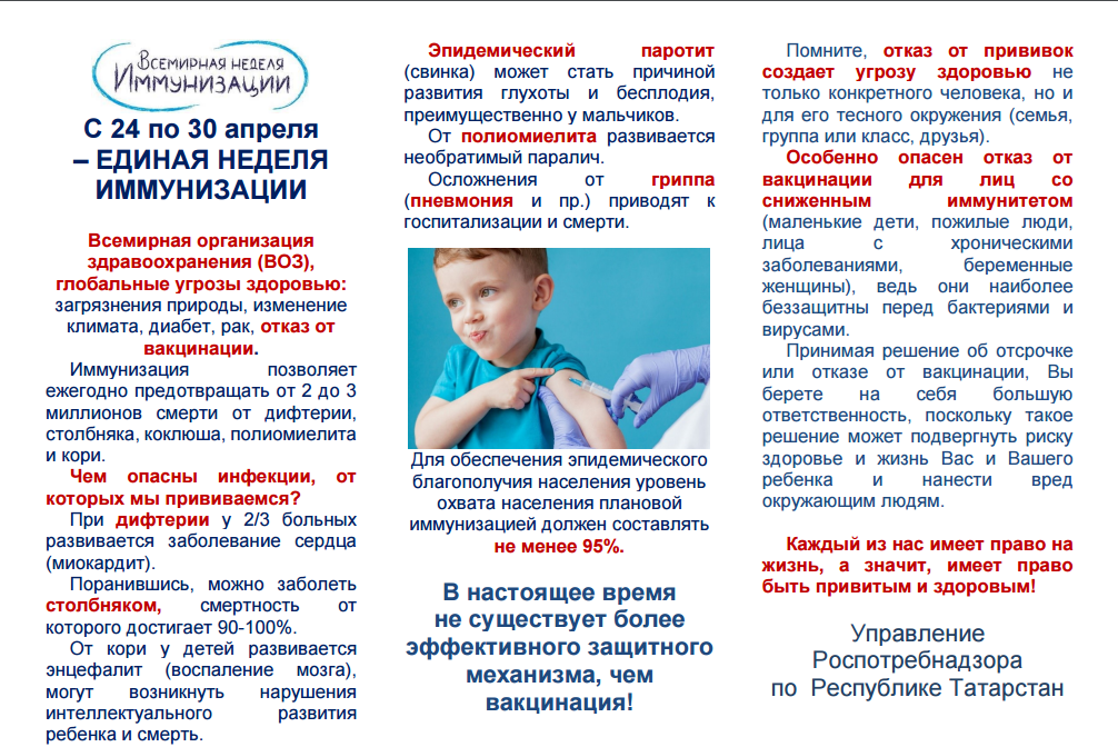 Россия Федерациясендә, шул исәптән Татарстан Республикасында, Роспотребнадзор планы нигезендә, 2022 елның 24 апреленнән 29 апреленә кадәр Бердәм иммунизация атнасы үткәрелә.