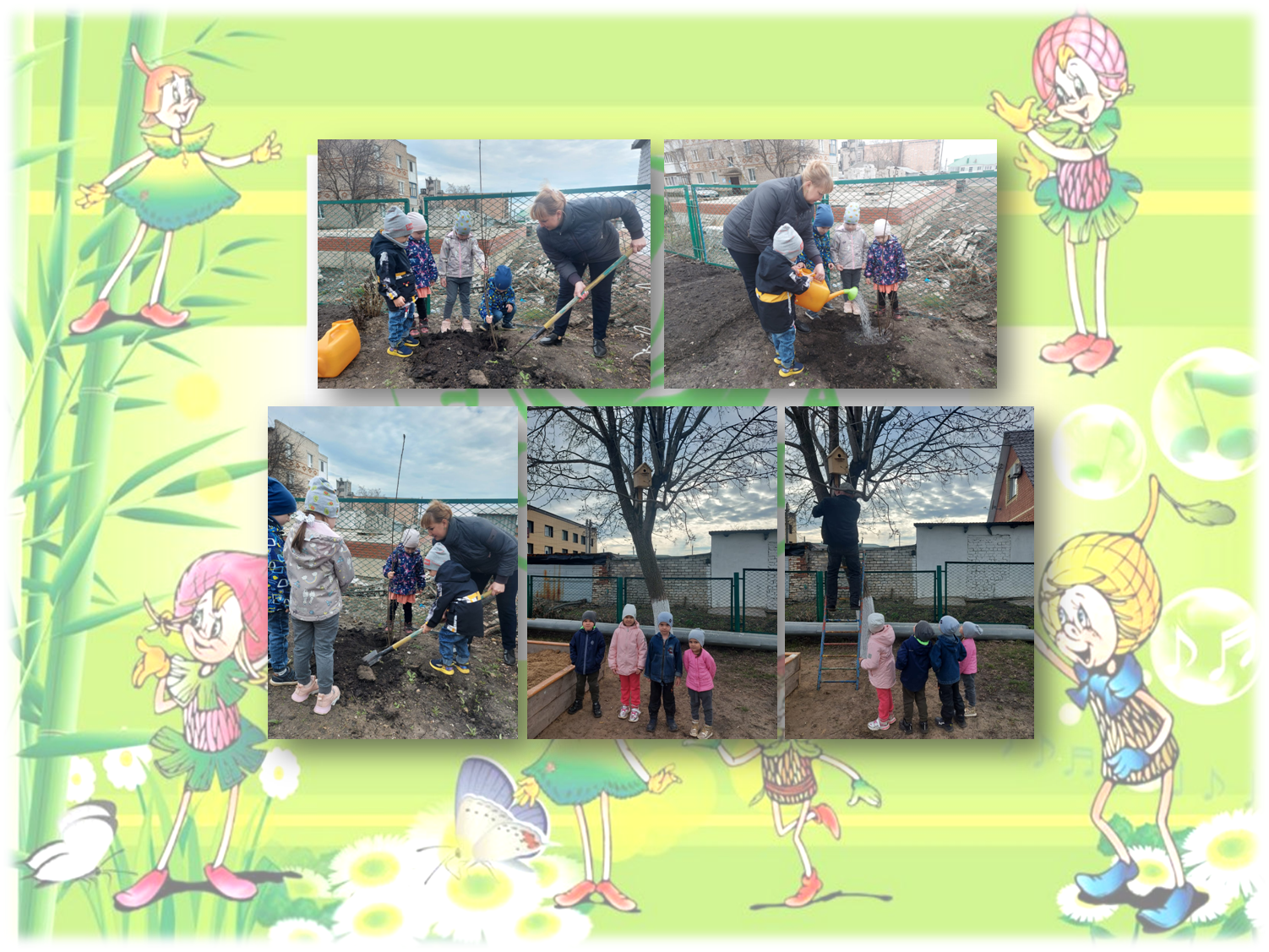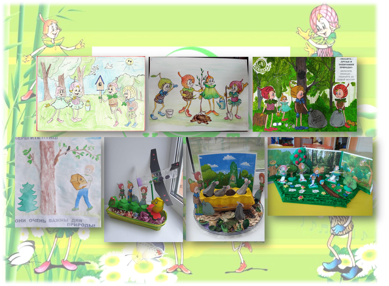 Ребята средней группы «Б» с воспитателем посадили на участке дерево и повесили скворечник для птиц. Вместе с родителями нарисовали рисунки на тему «Эколята на защите природы».
