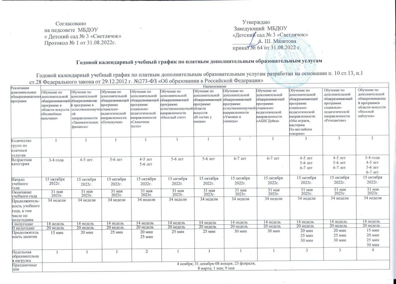Годовой календарный учебный график по платным доп услугам