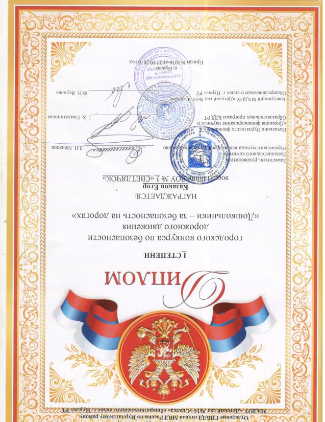 Диплом 1 степени в конкурсе города «Дошкольники – за безопасность на дорогах»- Казаков Егор; 2016г./«Мәктәпкәчә яшьтәге балалар – юлларда иминлек өчен » исемле шәһәр конкурсында - Казаков Егор 2016 елны 1 дәрәҗә дипломына лаек булды