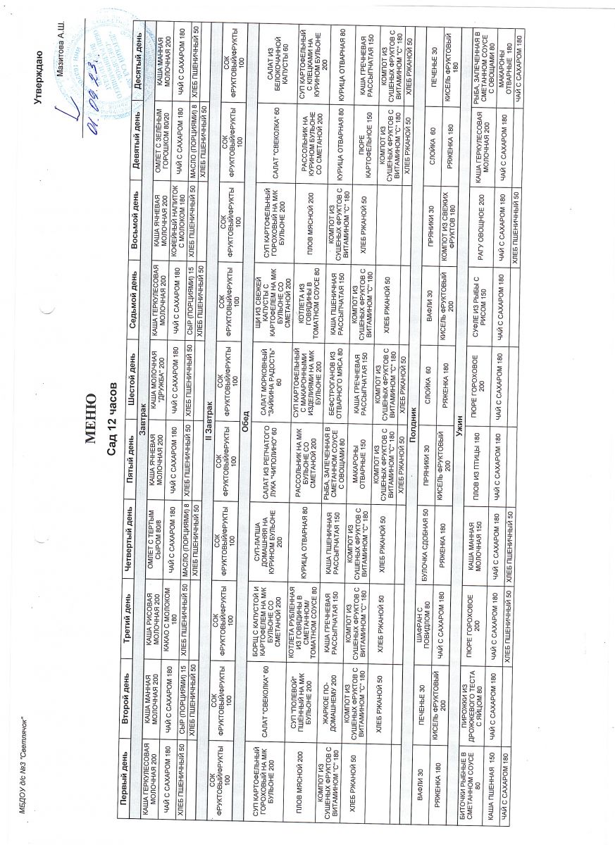 10-ти дневное меню МБДОУ "Детский сад №3 "Светлячок" общеразвивающего вида г.Нурлат РТ