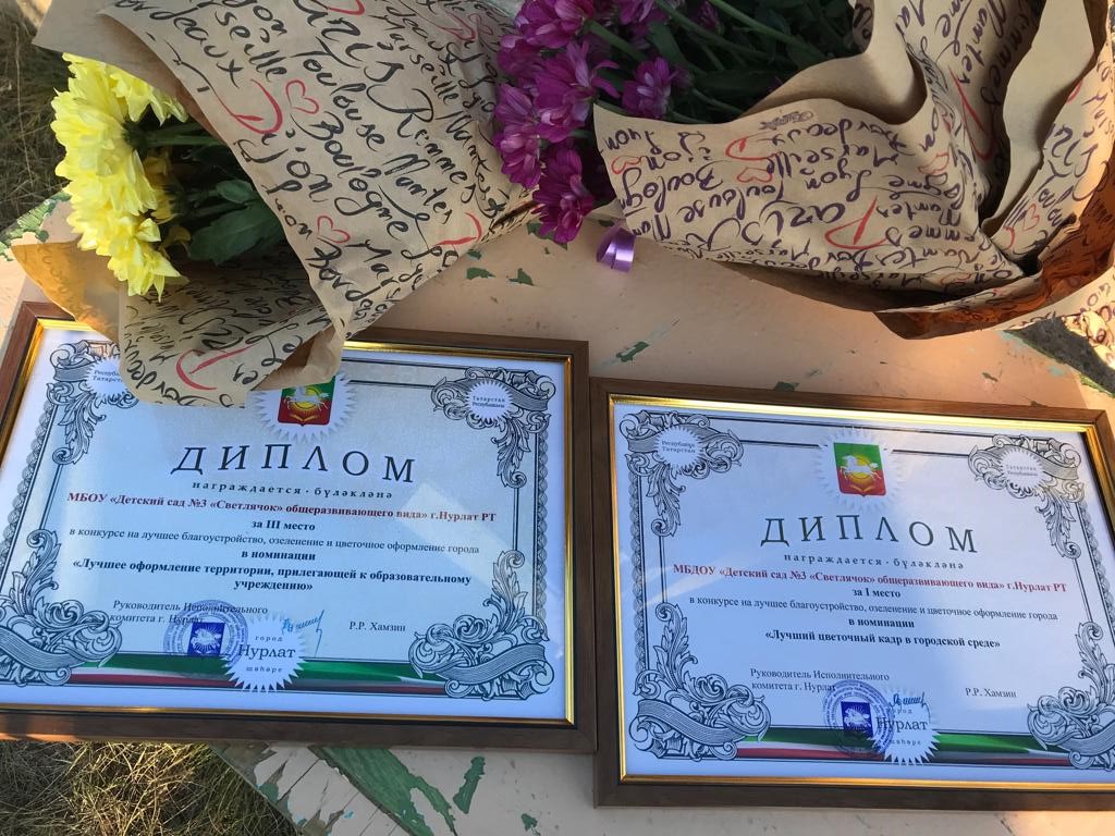 Безнең балалар бакчасы шәһәрне иң яхшы төзекләндерү, яшелләндерү һәм чәчәк бизәү конкурсында катнашты һәм "Шәһәр тирәлегендә иң яхшы чәчәк кадры" номинациясендә I урын өчен Диплом, "Белем бирү учреждениесе янындагы территорияләрне иң яхшы бизәү"номинациясендә III урын өчен Диплом белән бүләкләнде.