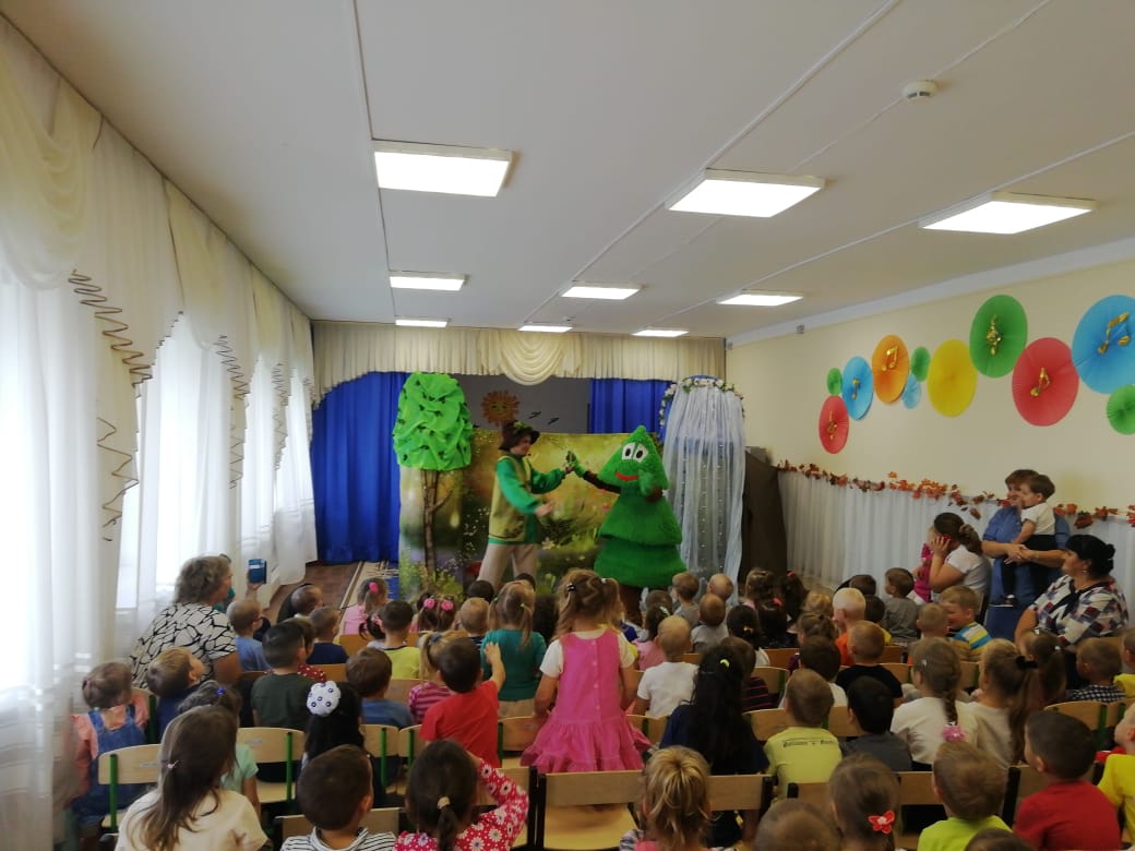 19 сентября наш детский сад посетил Нижнекамский кукольный театр «Веселая команда». Они выступили перед ребятами с поучительным выступлением «Лесная сказка». Герои сказки рассказали ребятам, как нужно вести себя на природе. А так же провели со зрителями игры на внимание. Дети остались довольны представлением./ 19 сентябрь көнне безнең балалар бакчасында Түбән Каманың «Күңелле команда» курчак театры кунакта булды. Алар балалар алдында «Лесная сказка» гыйбрәтле чыгышы белән чыгыш ясадылар. Әкият геройлары балаларга табигатьтә үзеңне ничек тотарга кирәклеге турында сөйләделәр. Шулай ук тамашачылар белән уеннар да уздырылды. Балалар бу тамашадан бик канәгать калдылар.