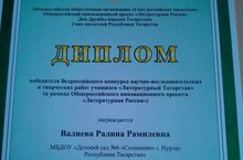 Дипломом наградили ВАЛИЕВУ РАЛИНУ РАМИЛЕВНУ победителя Всероссийского конкурса научно-исследовательских и творческих работ учащихся "Литературный Татарстан" (в рамках Общероссийского инновационного проекта "Литературная Россия"
