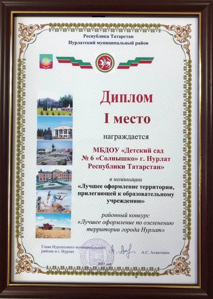 2021г. Диплом 1 место в номинации "Лучшее оформление территории, прилегающей к образовательному учреждению" в районном конкурсе "Лучшее оформление по озеленению территории г. Нурлат" Диплом