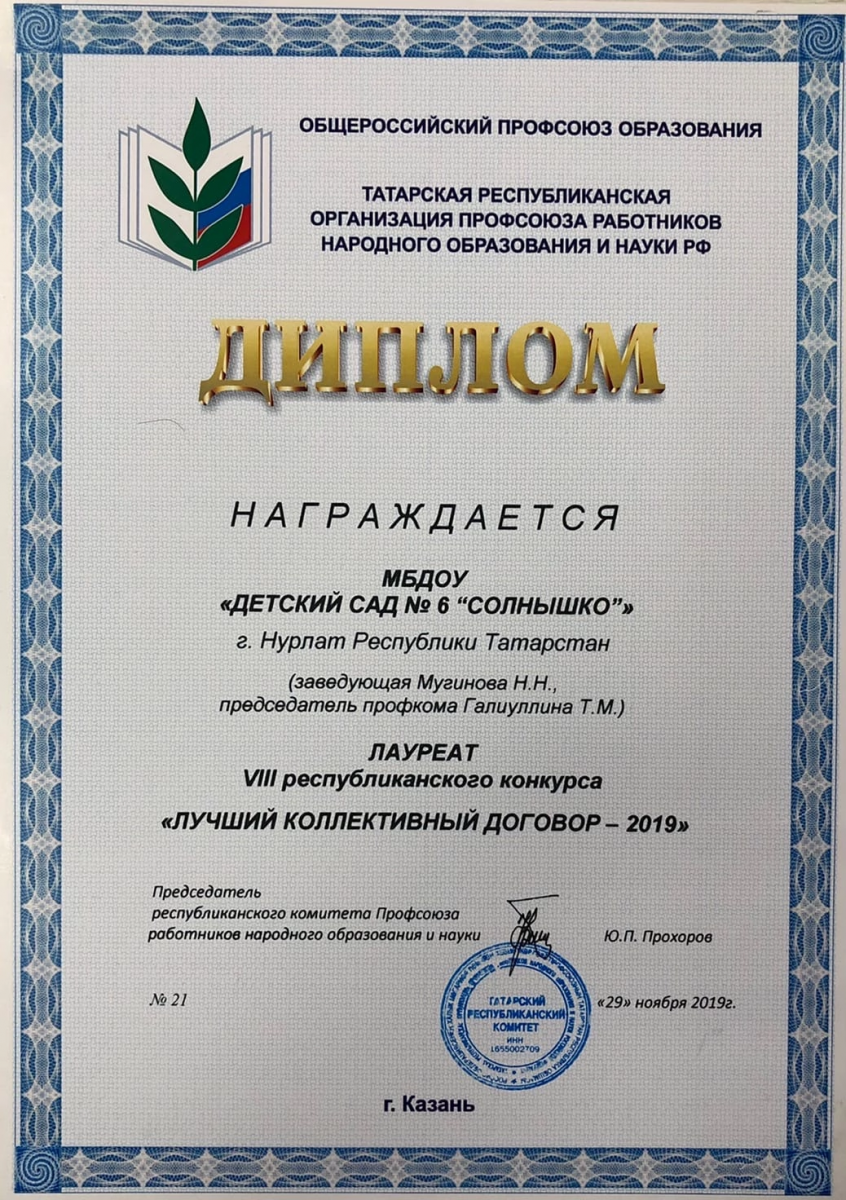 2019г. Диплом лауреат республикансого конкурса "Лучший коллективный договор" Диплом