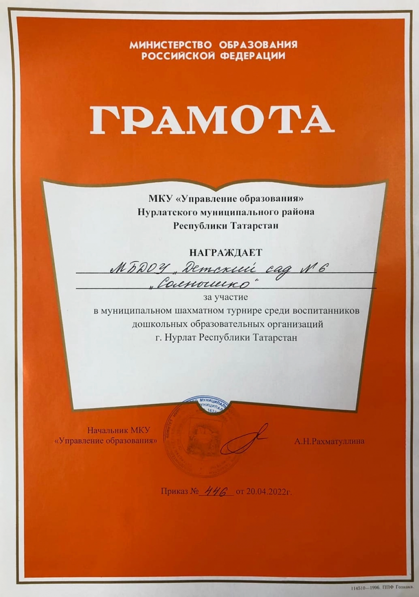 2022г. Грамота за участие в муниципальном шахматном турнире Грамота
