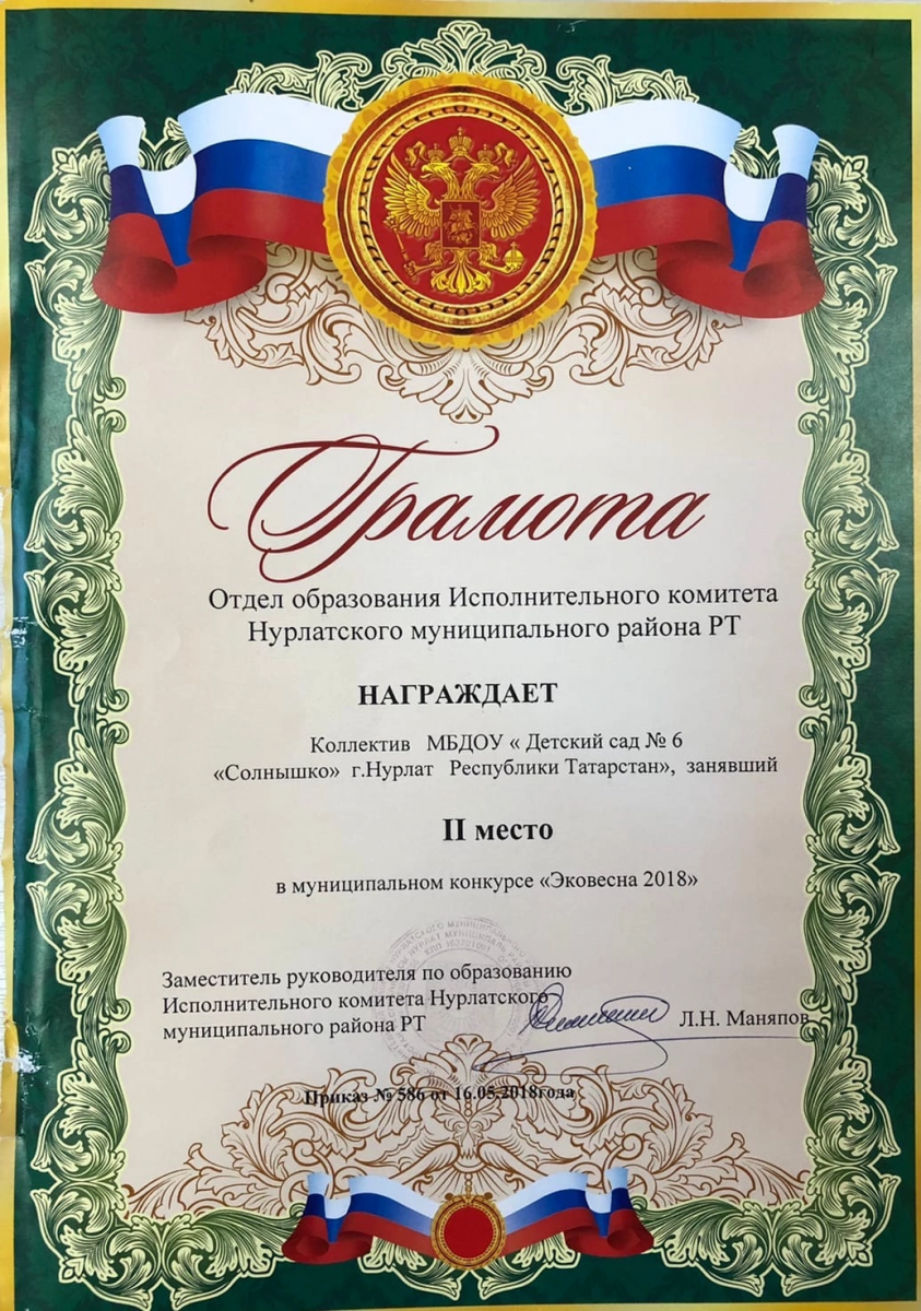 2016г. Грамотой МБДОУ "Детский сад № 6 "солнышко" г.Нурлат РТ за активное участие в районном этапе республиканского конкурса "Зеленый огонек" в 2016г грамота