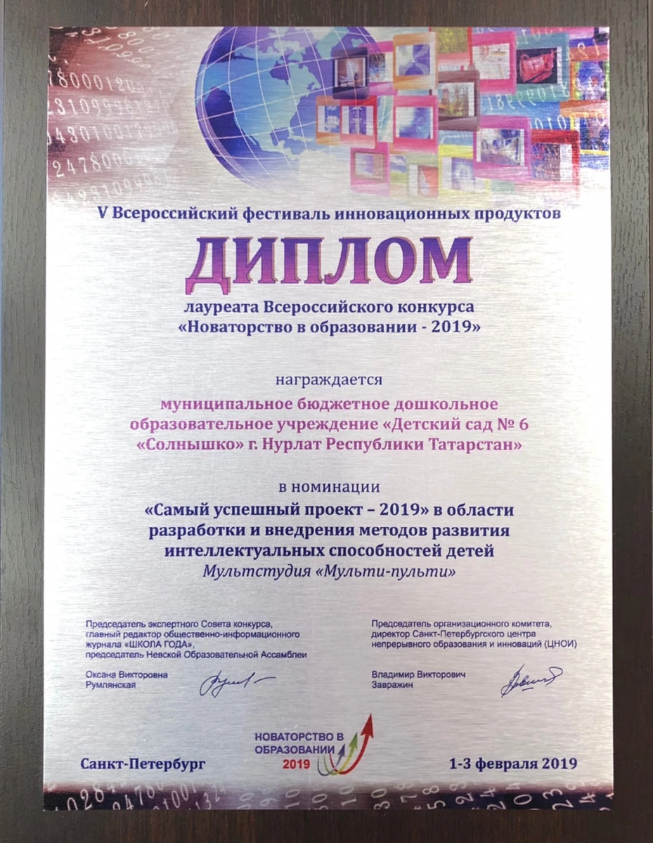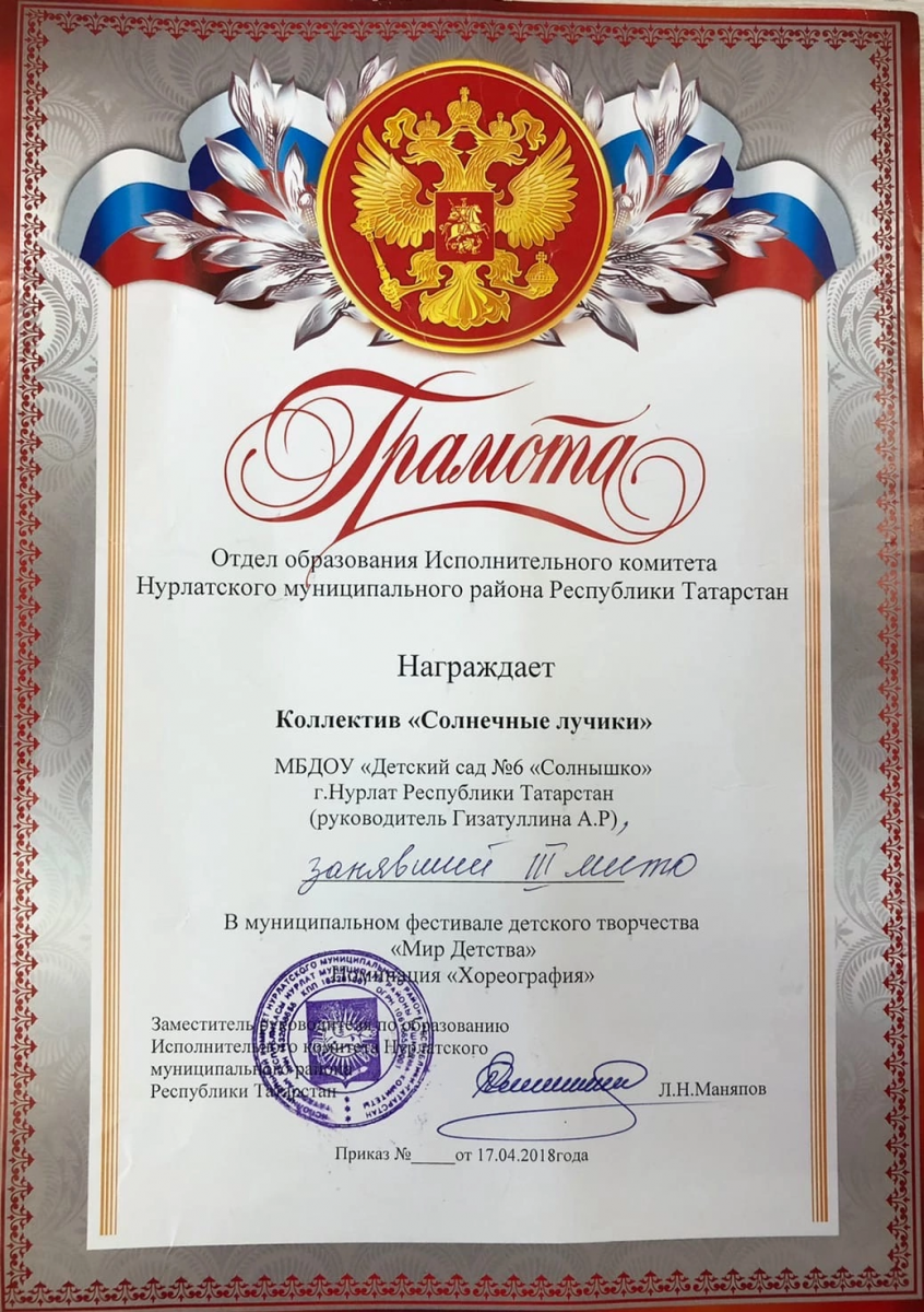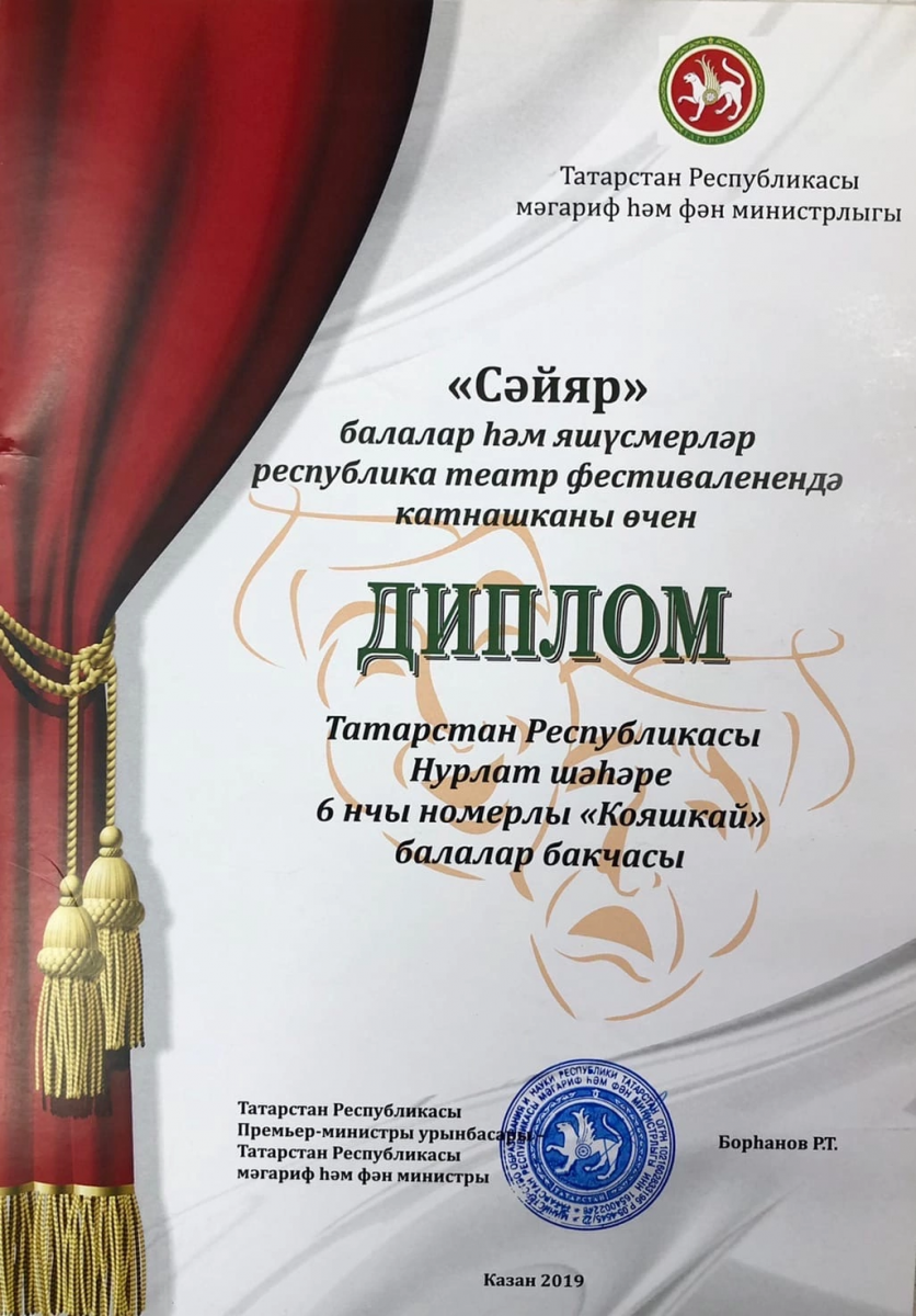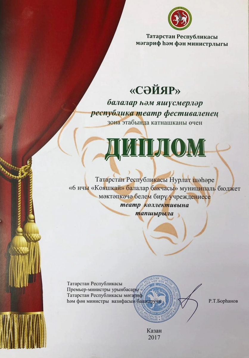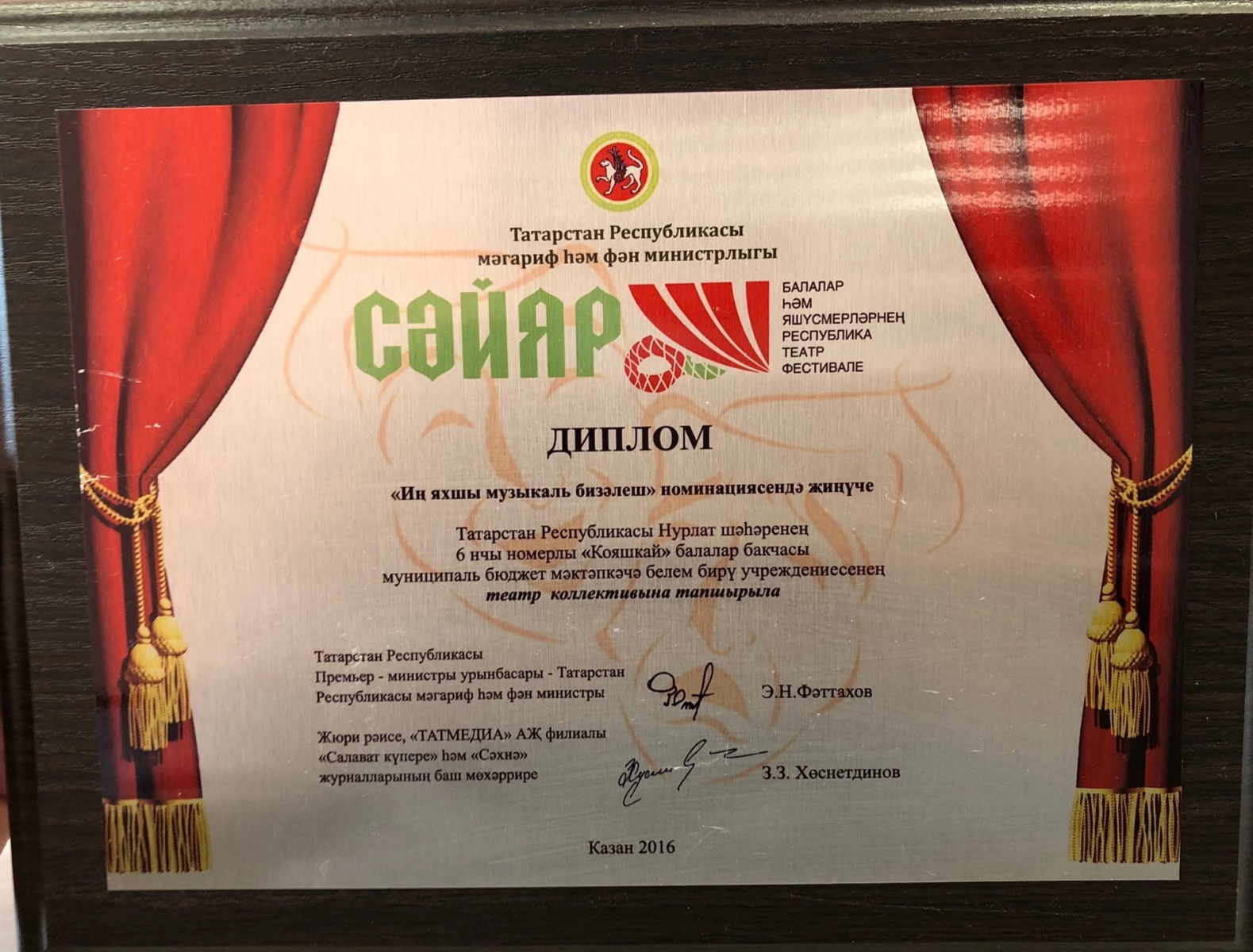 2016г. Дипломом награждается детский коллектив МБДОУ " Детский сад № 6 "Солнышко" г.Нурлат РТ , занявшую I место в муниципальном театральном фестиваль-конкурсе "Сайяр" от 13.10.2016г Диплом.
