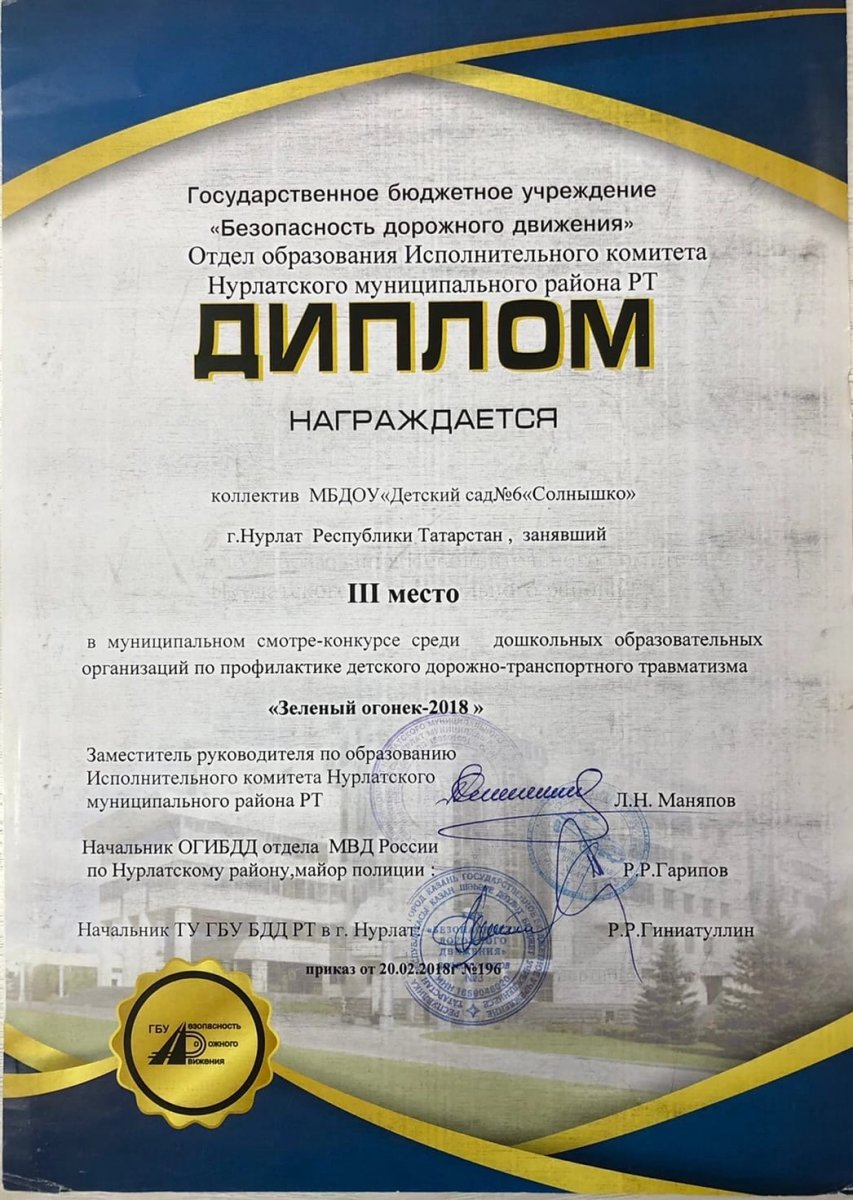 2018г. Диплом 3 место в муниципальном смотр - конурсе по профилактике детского дорожно - транспортного травматизма "Зелёный огонёк" Диплом