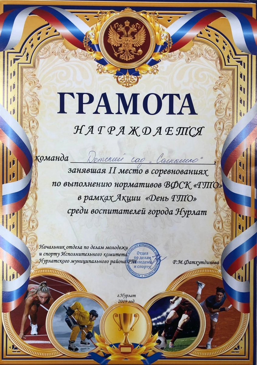 2019г. Грамота 2 место в соревнованиях ГТО Грамота
