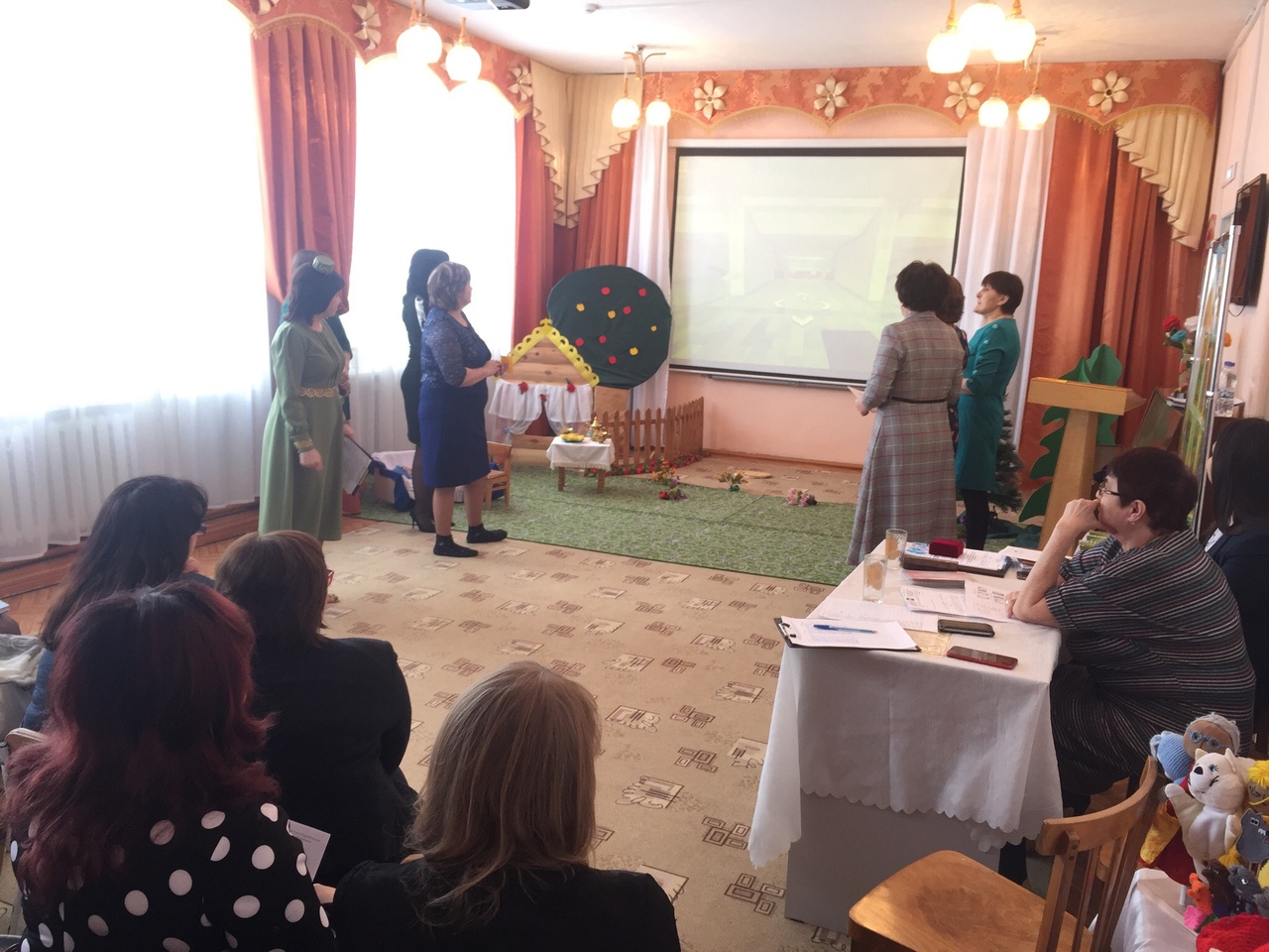 27 февраль көнне безнең балалар бакчасында мәктәпкәчә белем бирү учреждениеләре мөдирләренең "Федераль дәүләт белем бирү стандартлары өлкәләренең бурычларын театральләшкән эшчәнлек аша гамәлгә ашыру" темасына киңәшмәсе узды.