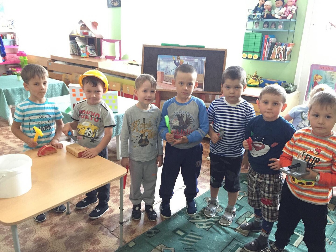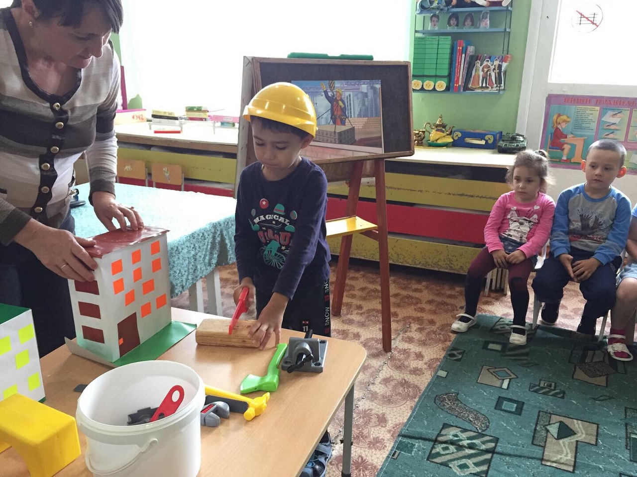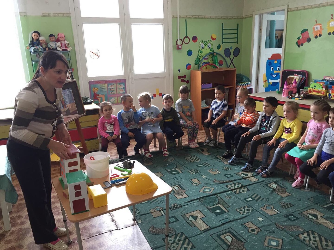 Бүген төркемнәрдә тәрбиячеләр балалар белән төзүче һөнәре барлыкка килү тарихы турында әңгәмәләр үткәрделәр, балалар мультфильмнар карадылар, конструкторлардан төрле корылмалар төзеделәр, төзелеш тармагы хезмәткәрләре һөнәрләренең рәсемнәре төшерелгән иллюстрацияләр карадылар.