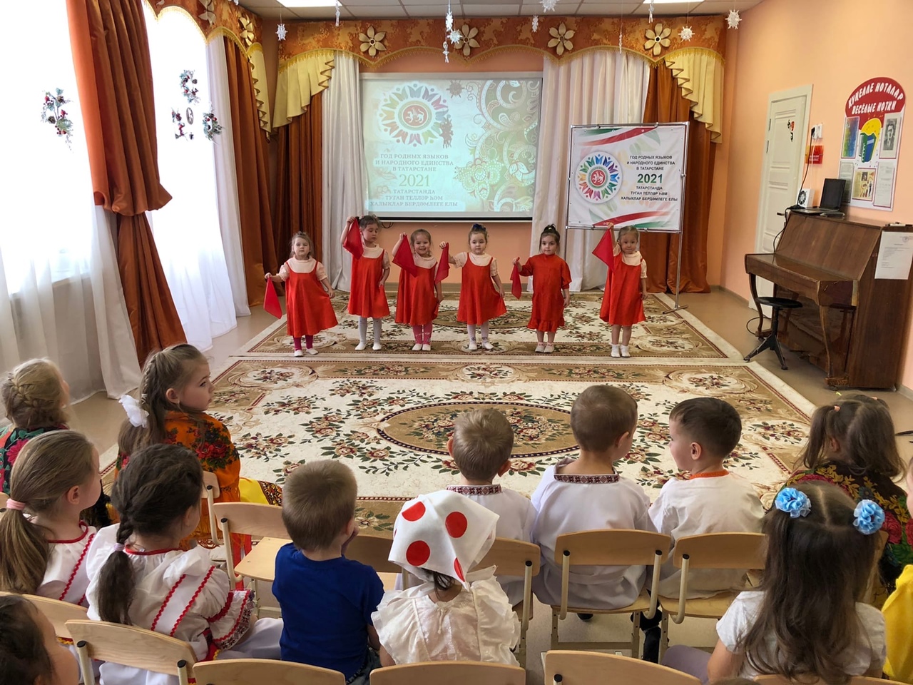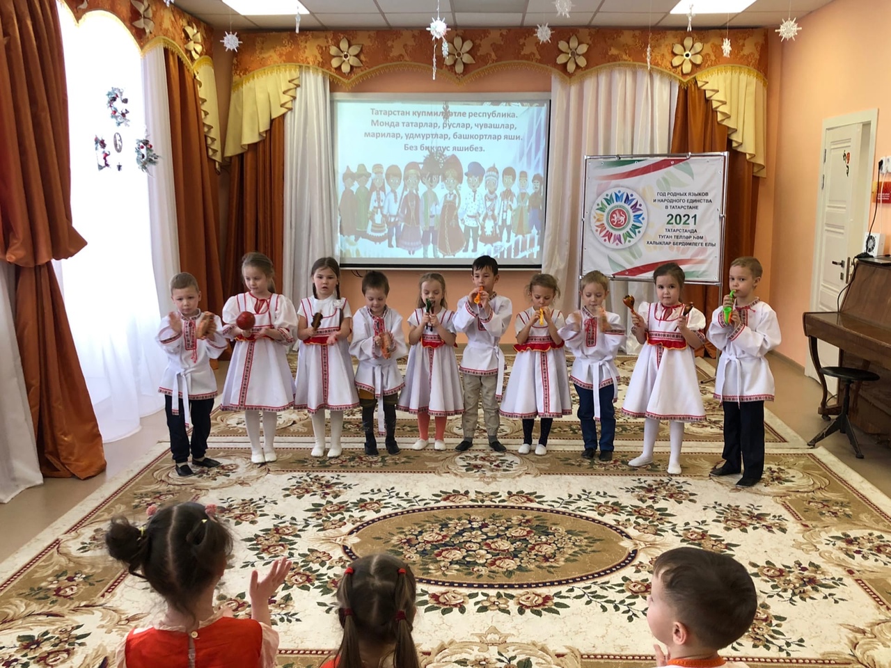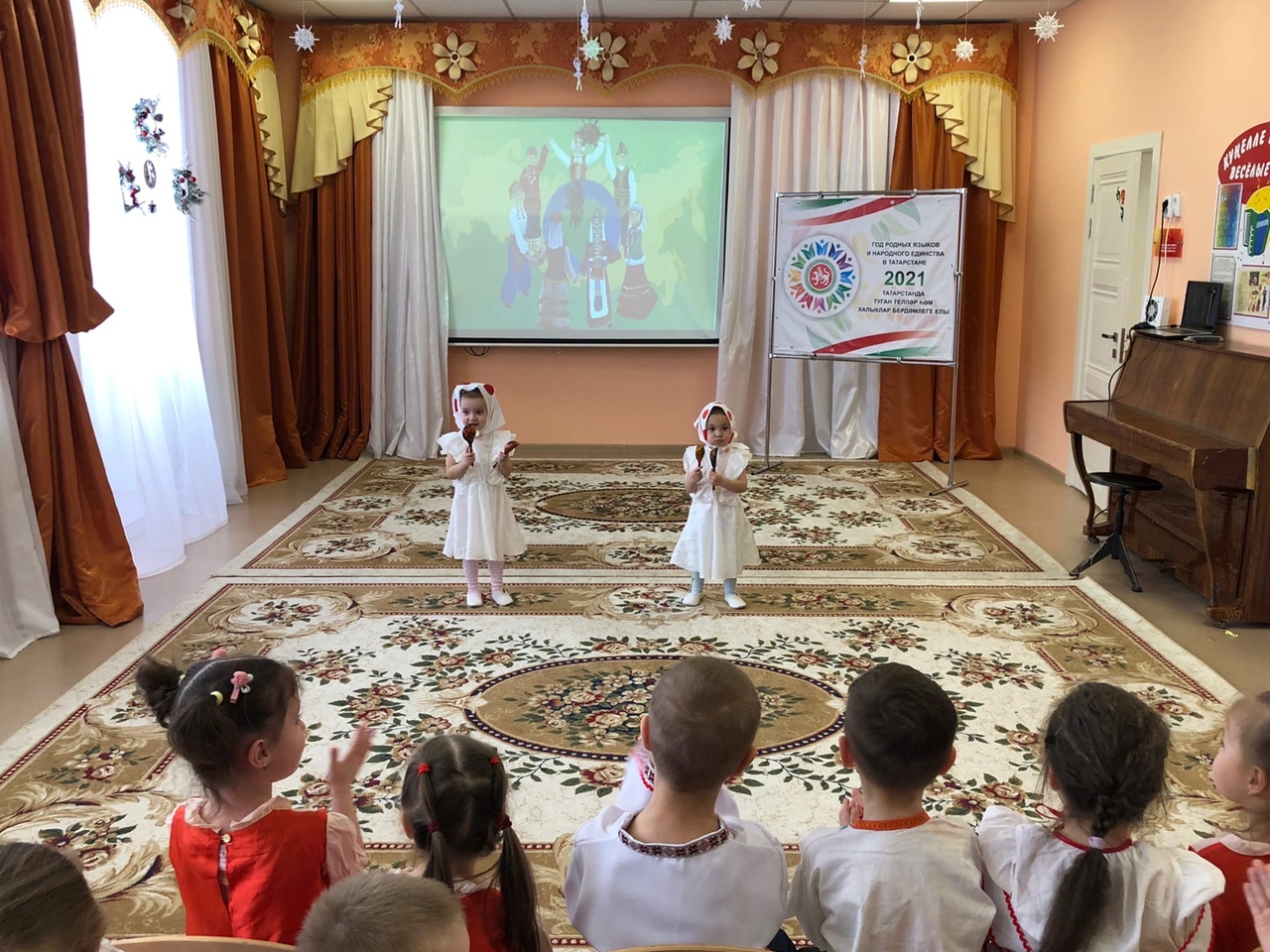 Төрле халыкларның җырлары һәм биюләре белән Татарстан Республикасында Туган телләр һәм Халык бердәмлеге елын үткәрдек. Чарада балалар бакчасында тәрбияләнүчеләр һәм педагоглар катнашты. Бәйрәмдә милли көйләр яңгырады, милли киемнәрдә биеделәр һәм җырладылар. Балалар туган телләр турында шигырьләр сөйләделәр, милли уеннар уйнадылар. Төрле милләт вәкилләрен берләштереп, бәйрәм тату һәм күңелле үтте.