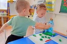 Малыши группы "Крепыши" с Рузалией Рашитовной лепили сегодня угощение для Зайчика. Дети знакомились с пластилином, изучали свойства, учили цвет (зелёный). Попытались сделать свой первый огурчик.