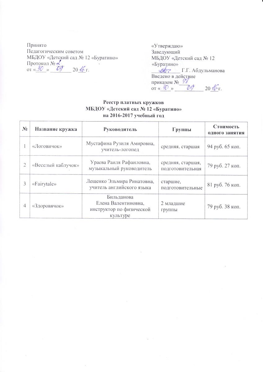 Прейскурант цен платных кружков на 2021-2022 учебный год