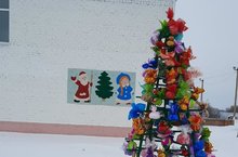 Вот такая креативная ёлочка встречает детей во дворе школы