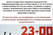 Соблюдайте Закон Республики Татарстан «О мерах по предупреждению причинения вреда здоровью детей, их физическому, интеллектуальному, психическому, духовному и нравственному развитию в Республике Татарстан» (№71-ЗРТ от 14 октября 2010г.), запрещающий нахождение несовершеннолетних в ночное время (с 22 часов до 6 часов в период с 1 сентября по 31 мая включительно или с 23 часов до 6 часов в период с 1 июня по 31 августа включительно) без сопровождения родителей в общественных местах.