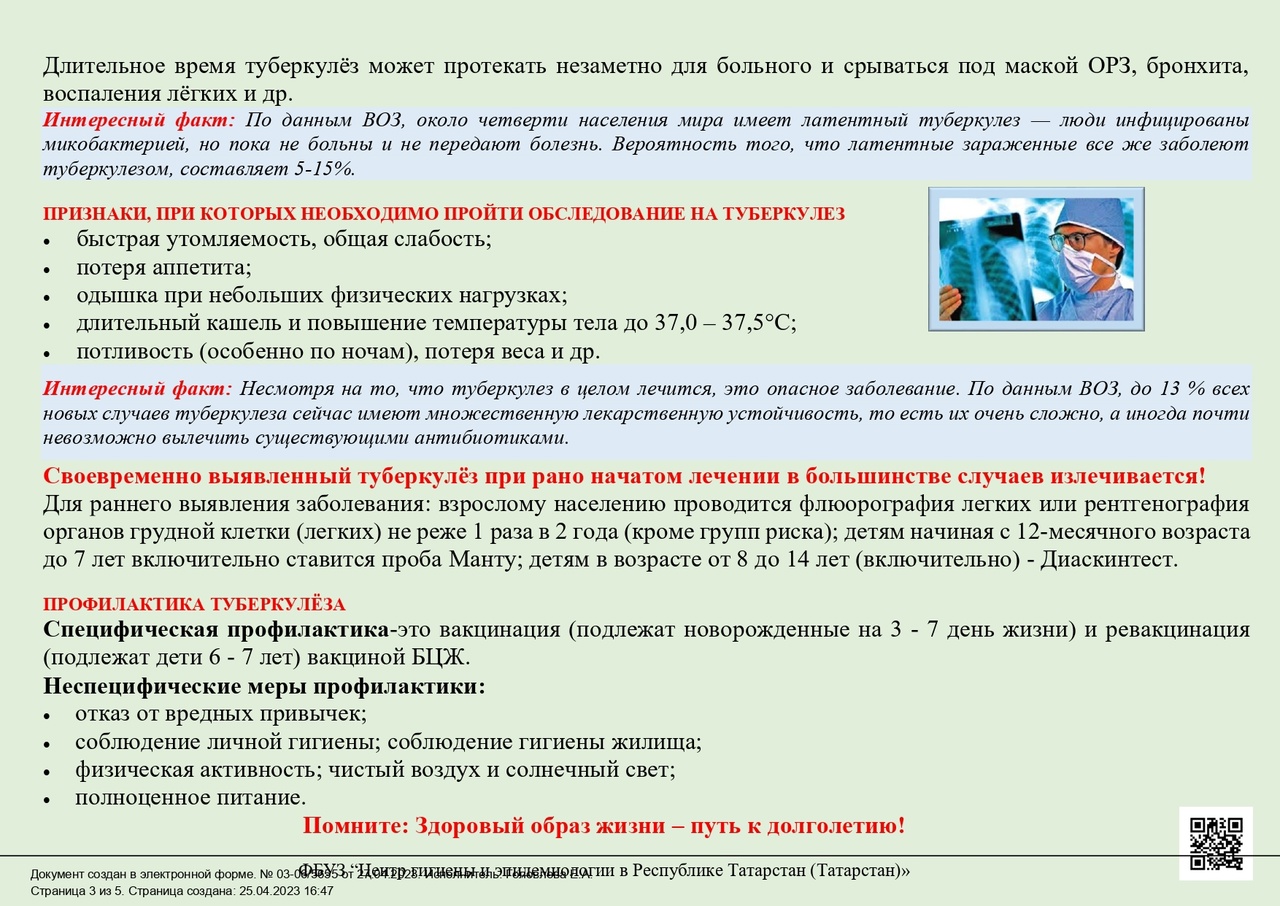 Памятки по профилактике туберкулёза для информирования населения от ФБУЗ "Центр гигиены и эпидемиологии в Республике Татарстан". Заболеваемость туберкулезом в России является одной из серьезнейших социальных проблем и борьба с ней рассматривается как важнейшая государственная задача. Решение этой задачи невозможно без понимания населением опасности этой инфекции и представления об основных принципах профилактики.