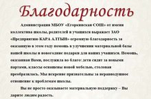 Администрация МБОУ "Егоркинская СОШ" от имени коллектива школы, родителей и учащихся выражает ЗАО "Предприятию КАРА АЛТЫН" огромную благодарность за оказанную в этом году помощь в улучшении материальной базы нашей школы и новогодние подарки для наших учащихся. Помощь, оказанная Вами, послужила во благо: дети сидят за новыми партами, классы оснащены новой мебелью, столовая преобразилась. Мы искренне признательны за неравнодушное отношение к проблемам школы.