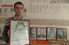 Учащийся 7 класса Тумаков Сергей в краеведческом музее с портретом своего деда, ветераном ВОВ. Бессмертный полк готовится к параду Победы.