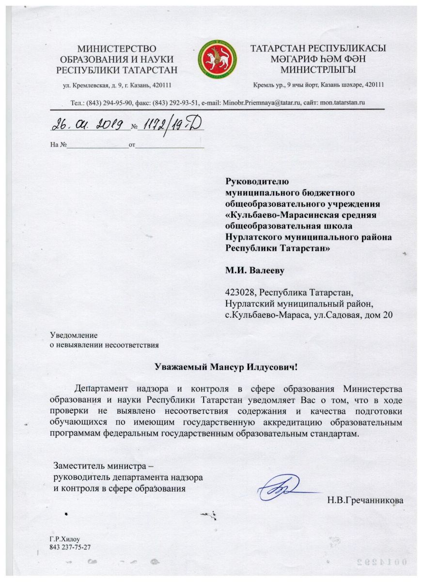 Уведомление о невыявлении несоответствия ( МО и Н РТ №1172/19-Д МО и Н РТ от 26.04.2019 г.)