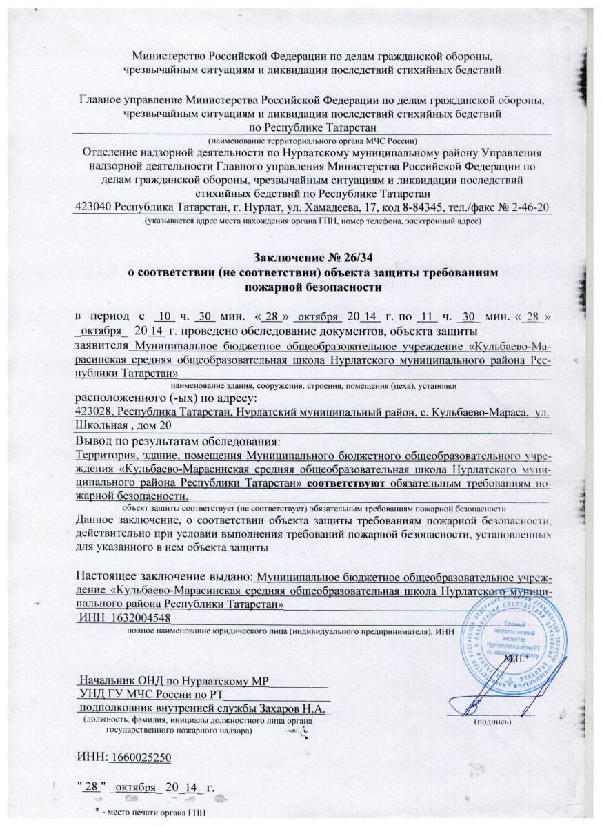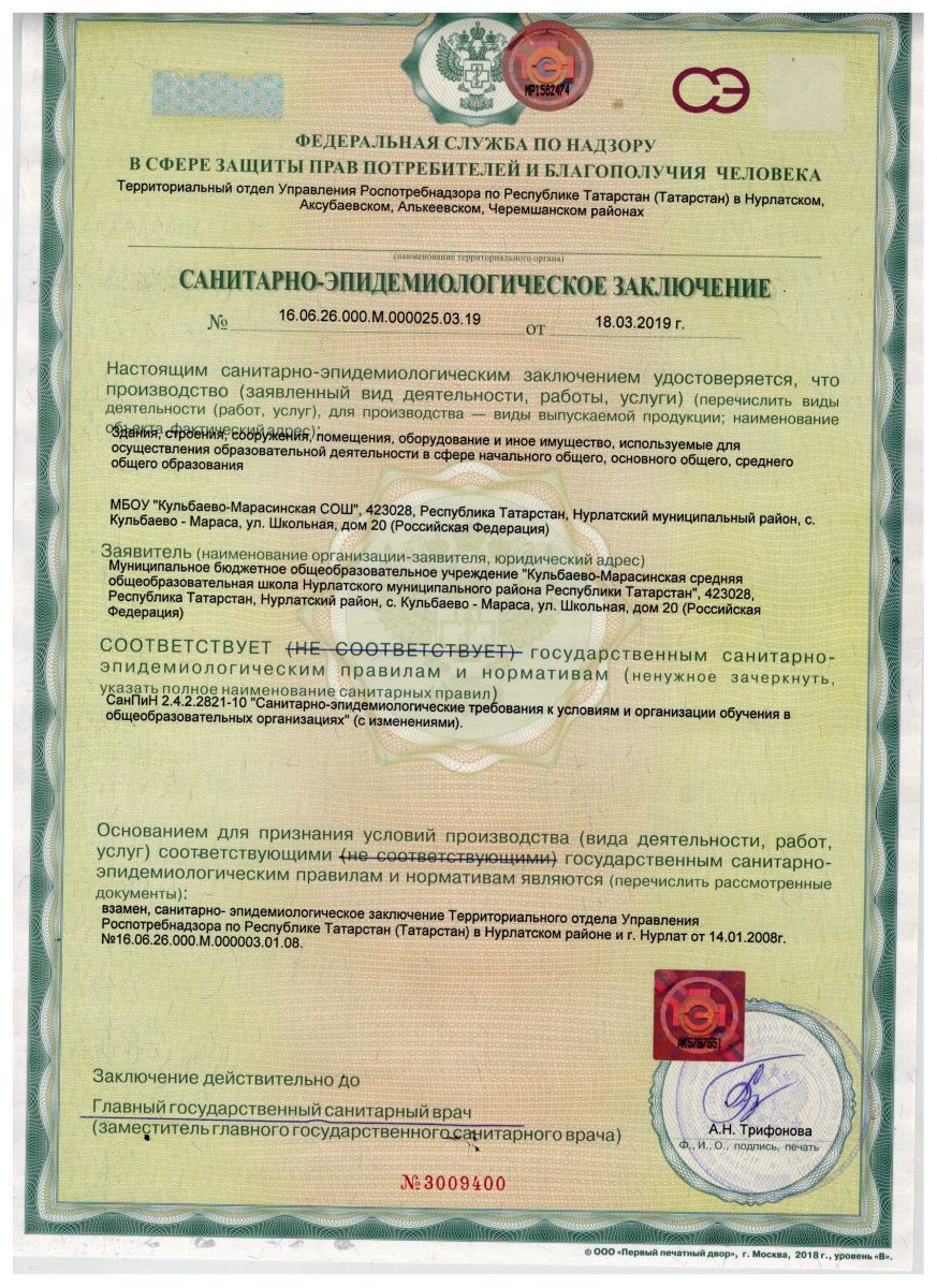 Санитарно-эпидемиологическое заключение МБОУ "Кульбаево-Марасинская СОШ"