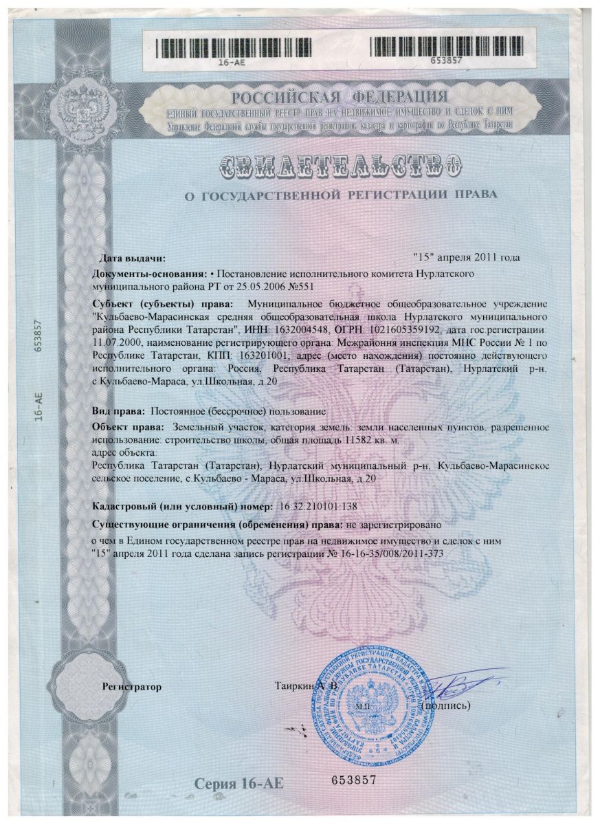 Свидетельство о государственной регистрации права на здание школы МБОУ "Кульбаево-Марасинская СОШ"
