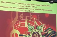 Сегодня прошел школьный этап VI районного конкурса патриотической песни "Служу России" 2020г., посвященный Дню защитника Отечества в рамках празднования 75 летия Победы. Звучали песни военных лет. Победителями стали сборная команда девочек 3 - 4 классов "Звездочки". Поздравляем!. Дальнейших успехов!