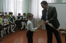 Сурәттә: җиңүчеләрне мәктәп директоры тәбрикли