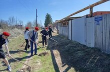 Юнармейцы помогают с уборкой придомовой территории, на участке семьи погибшего участника СВО. / Яшь армиячеләр йорт яны территориясен, СВО катнашучысының гаилә участогын җыештыруда булышалар.