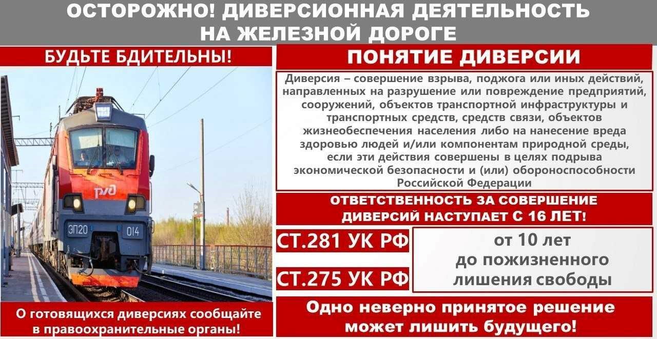Опубликовано: 26.12.2024Уважаемые родители! В настоящее время через различные социальные сети и мессенджеры ведется активная вербовка лиц для совершения различных диверсий на объектах железнодорожного транспорта (поджоги релейных шкафов, тягового подвижного состава, разрушение средств сигнализации и связи, стрелочных переводов и др.) за денежное вознаграждение. Особой группой риска являются подростки! За легкие, как им кажется, деньги они совершают деяния, опасность которых не осознают в полной мере. Данную деятельность курируют взрослые лица, имеющие опыт преступной деятельности. Ими даются четкие инструкции о том, какие действия нужно выполнить, в том числе по предупредительным мерам: как скрыть факт совершения диверсии, как пользоваться сотовой связью. В уголовном праве Российской Федерации под термином «диверсия» подразумеваются действия, направленные на экономическое и оборонное ослабление страны. Ответственность за совершение диверсий несут как граждане РФ, так и иностранные граждане и лица без гражданства, которые достигли к моменту совершения преступления 16-летнего возраста. Совершение диверсий гражданином РФ по заданию иностранной разведки или иностранной организации квалифицируется по совокупности с государственной изменой по ст. 275 и 281 УК РФ. Преступление относится к категории особо тяжких, санкция статьи предусматривает наказание в виде лишения свободы от 10 лет до 20 лет либо пожизненное лишение свободы.
